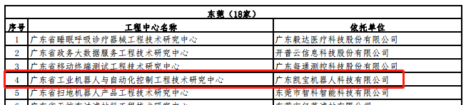 2020年4月16日,广东省科学技术厅公布了《2020年度第一批广东省工程技术研究中心认定名单》。由研究院3D打印与智能制造研究中心与广东凯宝机器人科技有限公司联合申报的广东省工业机器人与自动化控制工程技术研究中心获批省级工程技术研究中心。
