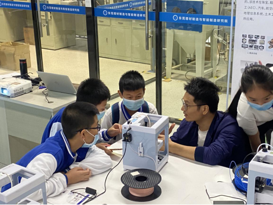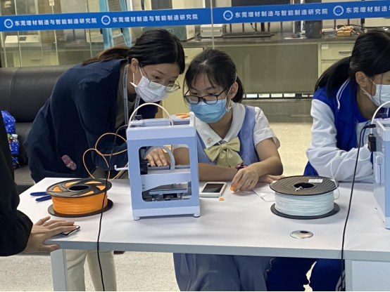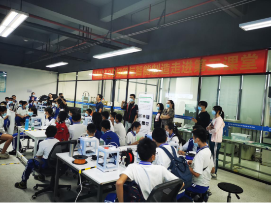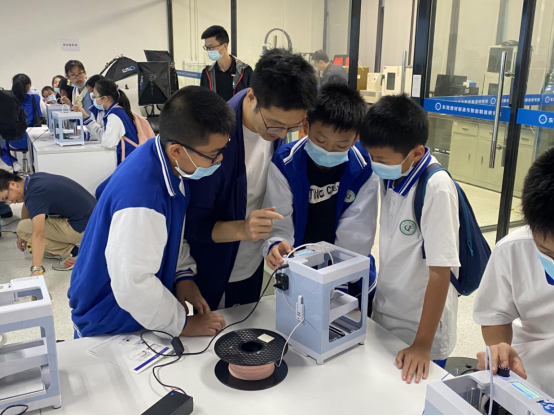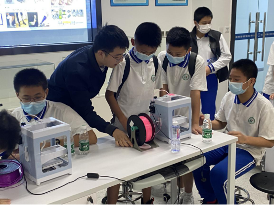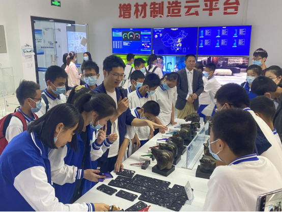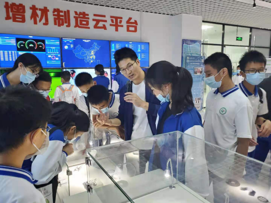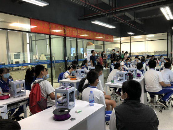 东莞中学松山湖学校初一14班教师、学生及学生家长亲临科普基地,一起学习和探讨3D打印的工艺技术、发展前景以及在智能制造方面的应用。
