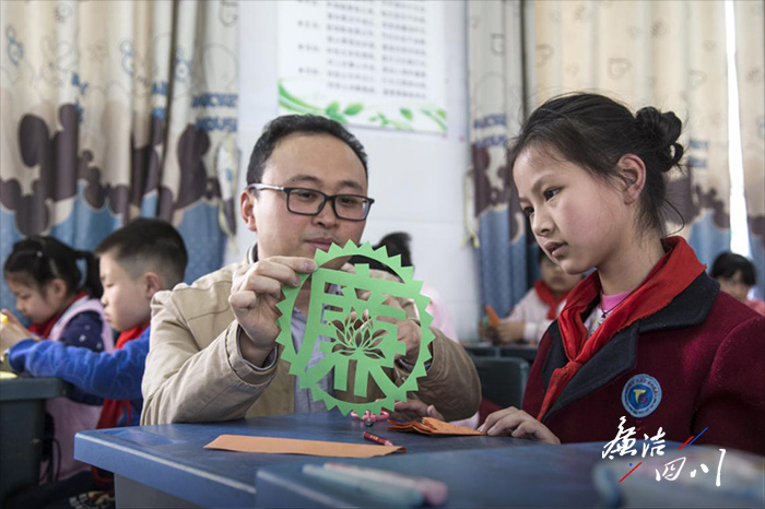 四川遂宁船山区天宫庙小学老师通过传授传统剪纸技艺方式,向学生播撒“廉洁”的种子(匡治 摄)