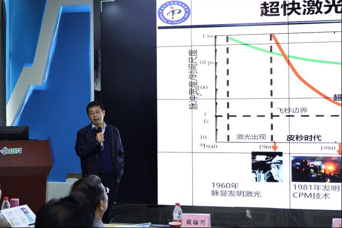 国家杰出青年基金获得者,中科院物理所研究员魏志义教授做《超快超强激光的物理世界》主题学术报告,介绍超快激光脉冲的发展,讲解皮秒、飞秒及阿秒激光脉冲等超快激光的特点与技术研究,以及即将新建的阿秒激光装置的功能。