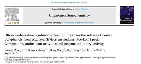 本研究以《Ultrasound-alkaline combined extraction improves the release of bound polyphenols from pitahaya (Hylocereus undatus ’Foo-Lon’) peel: Composition, antioxidant activities and enzyme inhibitory activity》为题发表在SCI收录期刊《Ultrasonics Sonochemistry》(IF2021= 9.34,1区TOP)。东莞理工学院-华南农业大学联合培养在读硕士钟烜钰为本文第一作者,该论文是我校生命健康技术学院与联合高校共同培养硕士研究生积累的又一新成果。