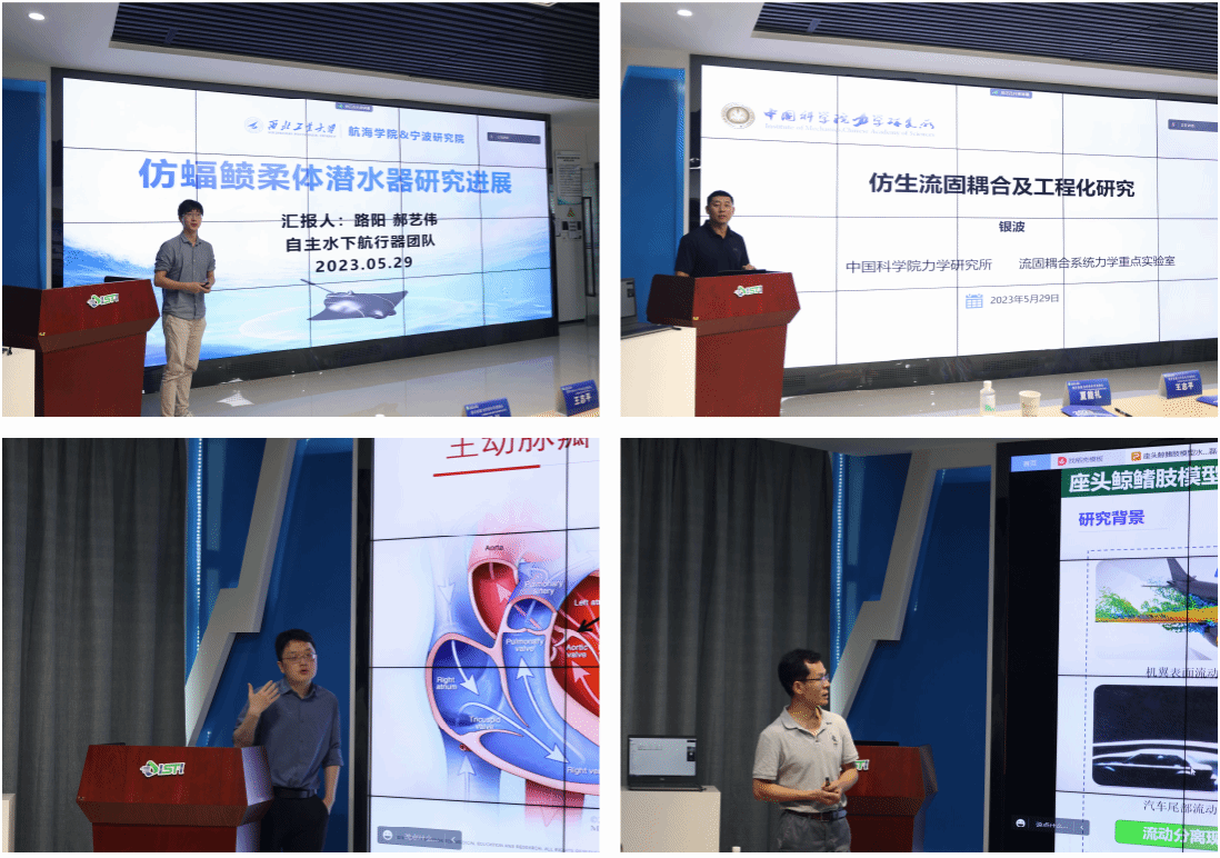 中国科学技术大学黄海波教授作了“生物推进力学模型中的自主运动标度律”的报告;中国科学院大学余永亮教授作了“波状推进的物理机制”的报告;西安交通大学孟学广副教授作了“残翅昆虫的运动学和气动力”的报告;南方科技大学余鹏副教授作了“复杂流体流动机理”的报告;中山大学白宏磊副教授作了“座头鲸鳍肢水动力学特性实验研究”的报告;中国科学院力学所银波副研究员作了“仿生流固耦合及工程化研究”的报告;北京大学朱驰助理教授作了“主动脉瓣狭窄的流固耦合计算模拟研究”的报告;华南理工大学陈烨助理教授作了“主动脉瓣与血液耦合研究”的报告;最后西北工业大学路阳博士给我们分享了仿蝠鲼柔体潜水器的研究进展。