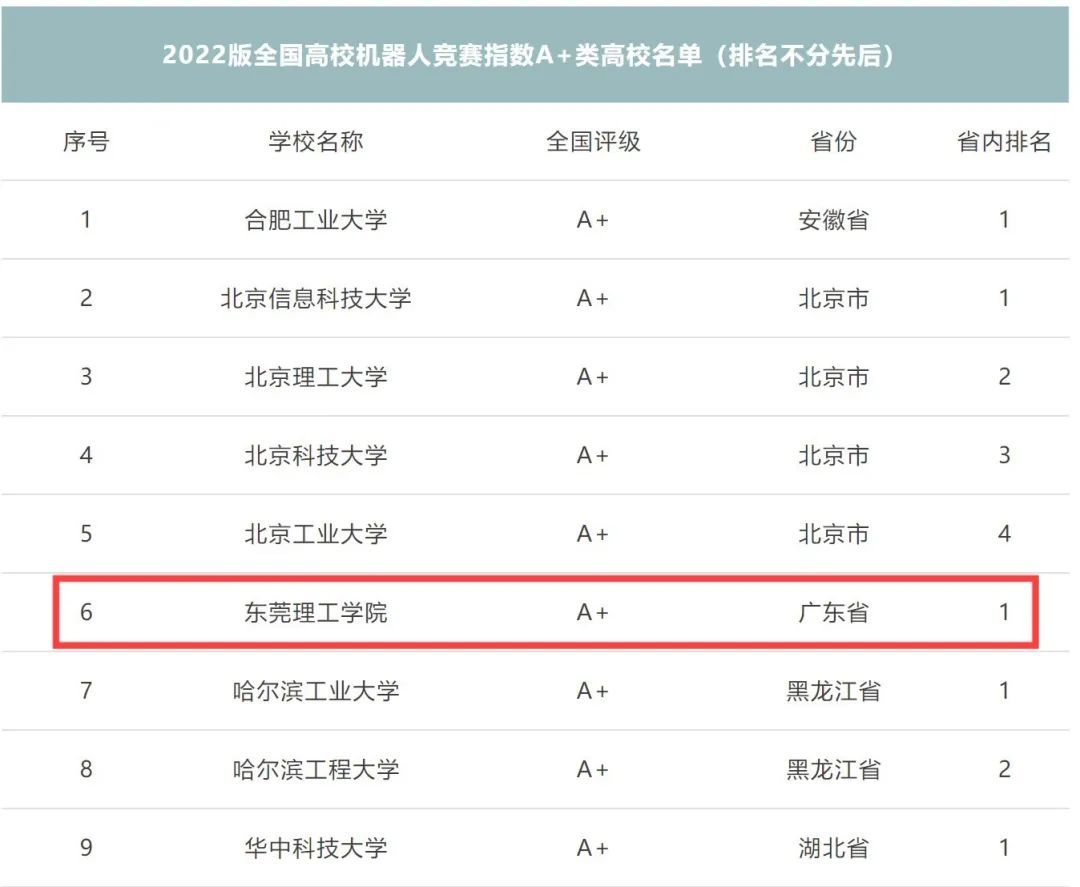 国际自主智能机器人大赛于2022年12月被列入国家级别的全国高校机器人竞赛指数。我校在全国高校机器人竞赛指数排名中,位居全国高效TOP2%,全国评级为A+,广东省内排名第一。