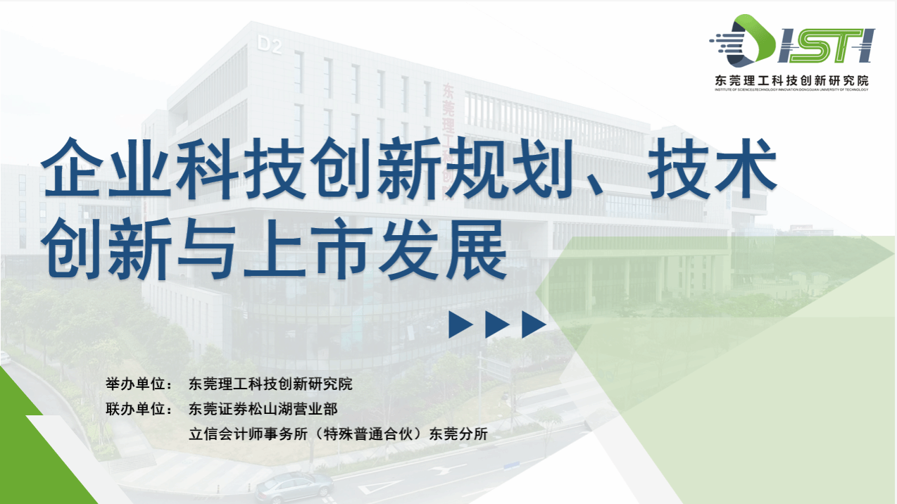 为进一步促进新型研发机构与科技企业的合作交流,推动与科技产业协同发展,构建湾区科技型企业创新平台,3044am永利集团官网(以下简称“研究院”)联合东莞证券松山湖营业部、立信会计师事务所(特殊普通合伙)东莞分所于2024年8月1日,在研究院智慧路演中心成功举办《企业科技创新规划、技术创新与上市发展》主题报告会。广东合通建业科技股份有限公司、广东全芯半导体有限公司、广东恒翼能科技股份有限公司等20多家科技企业派代表出席此次活动。