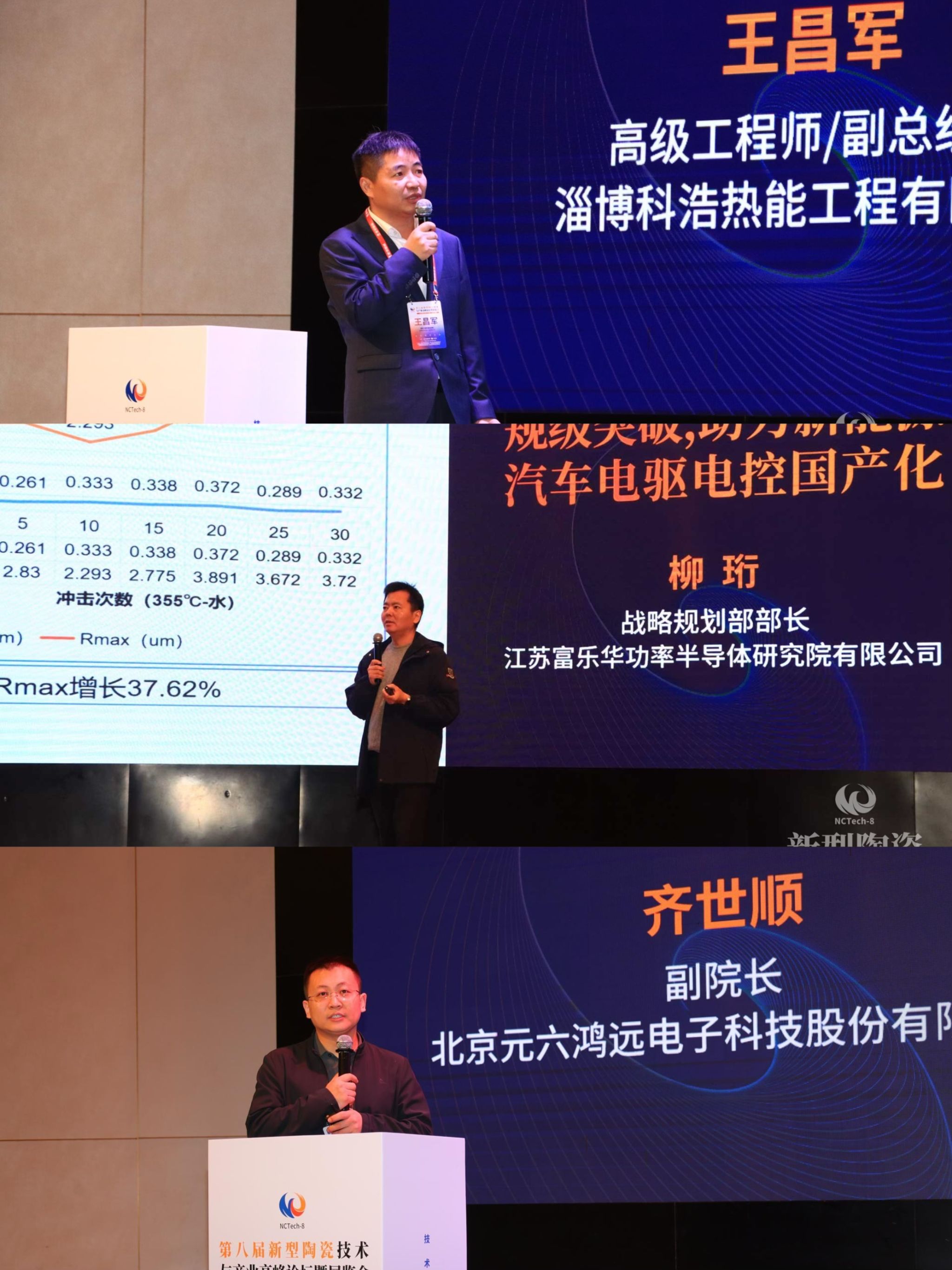 装备国产化支撑板块,淄博科浩热能工程有限公司高级工程师王昌军介绍《科浩热能大气烧结炉在半导体陶瓷产业烧成中的应用》,详细介绍该公司半导体陶瓷材料超级大气烧结炉方面的技术经验、经济效益应用案例;江苏富乐华功率半导体研究院有限公司柳珩分享《DBA 陶瓷铝基板:车规级突破,助力新能源汽车电驱电控国产化》,详解该该司推出的新型DBA(铝陶瓷基板)产品及应用优势,为汽车核心部件国产化升级提供支撑;北京元六鸿远电子科技股份有限公司副院长齐世顺围绕《应用于微组装领域的电子功能陶瓷系列产品研究》,介绍该公司瓷介电容系列产品在微组装应用方面的技术发展经验。