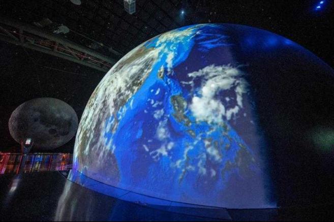 这个展区最夺人眼球的展项,是一个巨大的地球模型。它徐徐自转、昼夜交替,让观众仿佛置身太空,俯瞰这颗蓝色星球。讲解员说,地球模型上的陆地和海洋都在运动,演绎着46亿年间沧海桑田的变化。观众还可以走入地球模型内部,那里是光学天象厅,可以容纳100人。在光学天象厅里,你能看到城市夜晚少见的璀璨星空,中国人命名的星宿、西方人命名的星座,都在这片模拟星空中一一呈现,可教你辨认群星。