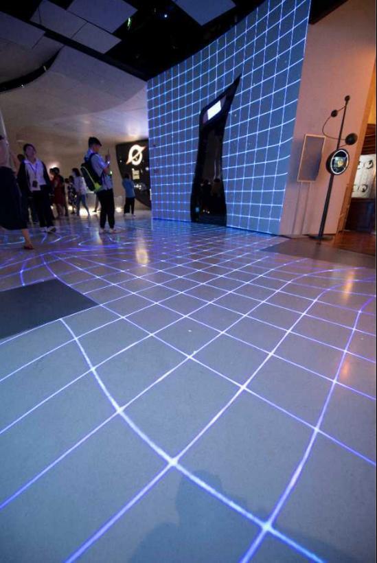 走进黑漆漆的相对论引力区,墙上和地上的扭曲光线,让人直观感受到“时空弯曲”。“来到这里的人越重,光线扭曲得就越厉害。”讲解员笑着说。这个区域呈现的是广义相对论基本原理——引力场是时空的弯曲,其曲率与物体质量相关。质量巨大的太阳导致的时空弯曲,让太阳系的行星等星体都围绕它转动。