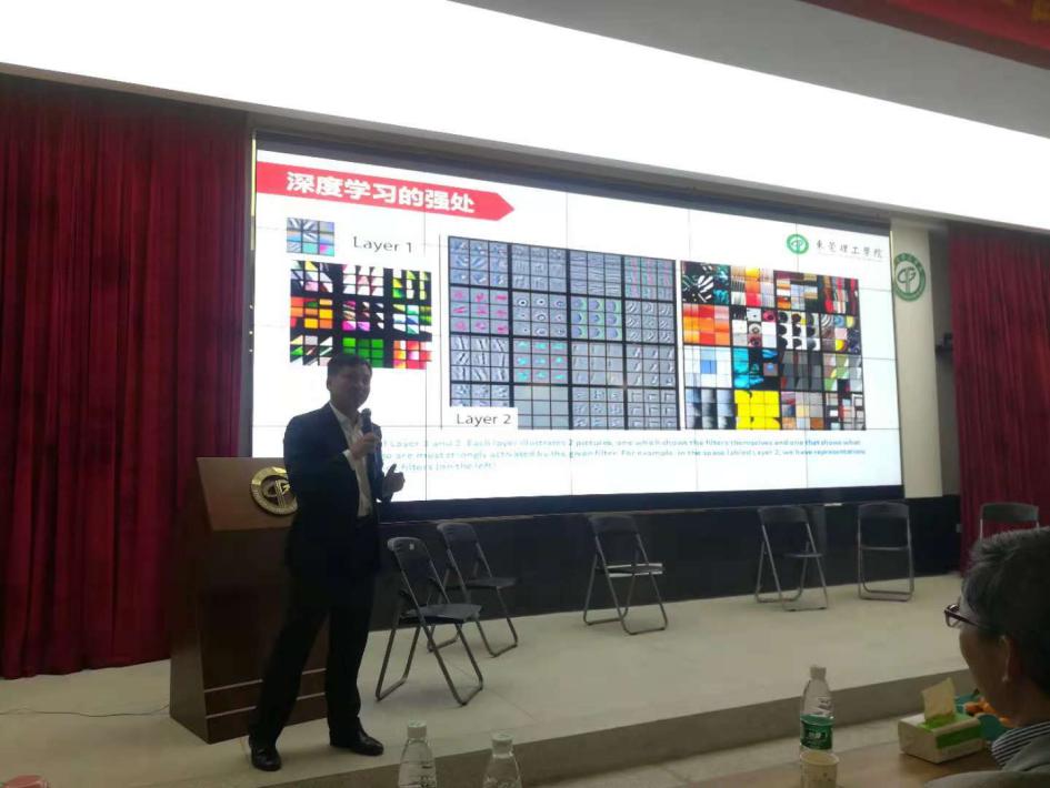 他先以一个计算机自动识别苹果和香蕉的具体案例,形象的介绍了什么是机器学习以及机器学习应用的场景;然后又为师生普及深度学习、神经网络等名词,介绍了深度学习在图像处理领域的应用;让原来混淆机器学习和深度学习的我们豁然开朗。