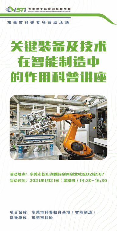 智能制造技术是一种先进的制造技术,近年来已在世界范围内得到广泛应用和发展,智能制造的核心是及时进行分析,判断,推理,决策和自适应决策。本文介绍了智能制造技术的本质,列出了智能制造技术在工厂中的应用,并提出了工厂实现未来智能制造的方向和思路。 ——展览信息—— 活动主题:关键装备及技术在智能制造中的作用科普讲座 活动地点:东莞市松山湖国际创新创业社区D2栋507 活动时间:2021年1月21日(星期四)14:30-16:30