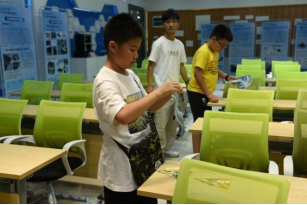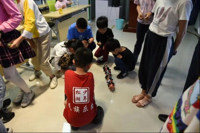 实验室成员展示“小机器鸟”,孩子们纷纷激动地想要亲自尝试启动小机器鸟。