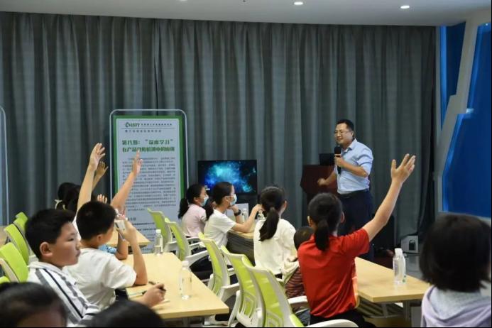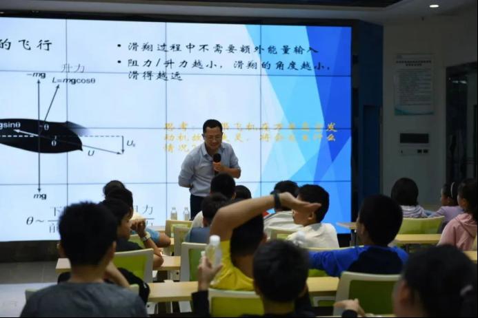以飞行的简单动力学为出发点,宋博士向孩子们解释了自然界中鸟类飞行的现象,为什么鸟要盘旋,为什么有些鸟的翅膀尖部羽毛是分开的……在对飞行的动力学进行了通俗的讲解后,孩子们对“飞机与火箭的区别”这一问题表现出强烈的兴趣,争先恐后举手回答,生动形象地表达了自己的观点,学习氛围十分活跃。
