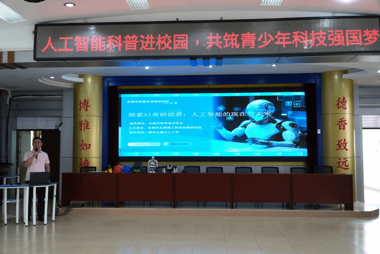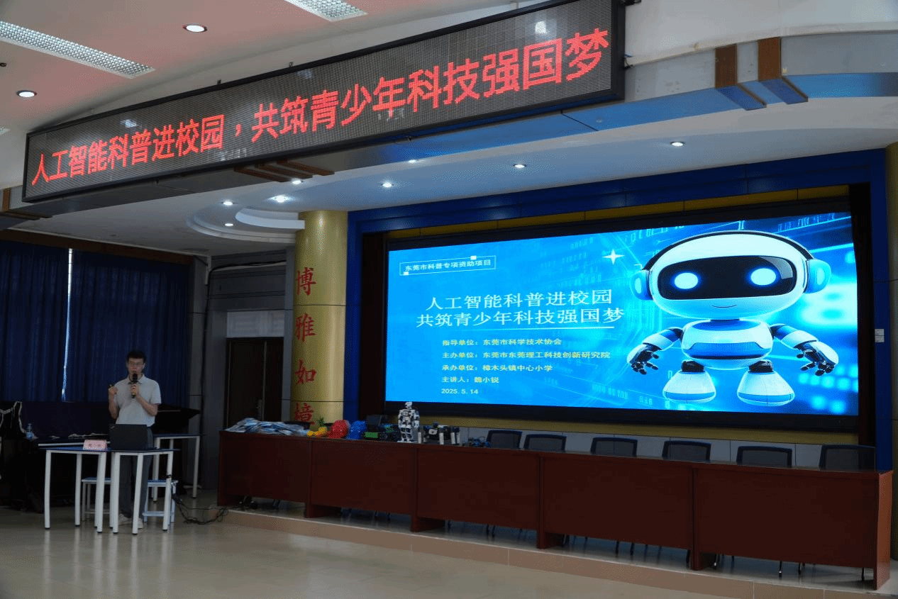 2025年5月14日,在东莞市科学技术协会的指导下,东莞市3044am永利集团官网联合樟木头镇中心小学,依托东莞市科普专项资助项目,举办了活动主题为:“无人驾驶智能小车”的人工智能科普活动。活动旨在通过生动的科普讲解与实物互动,让青少年深入了解人工智能,培养学生的计算思维与创新精神,引导学生认识人工智能的发展与应用。活动现场共有200多名学生与老师参与此次活动。