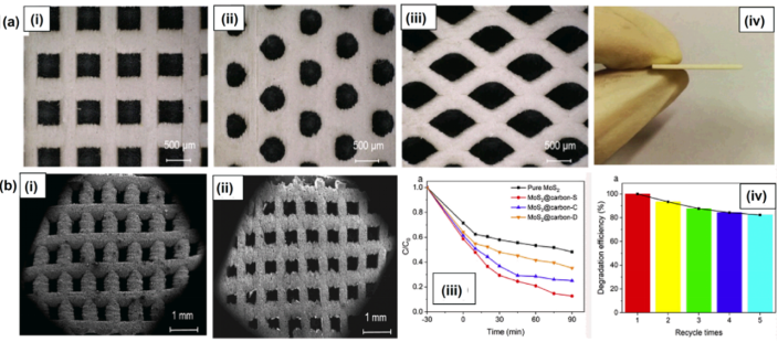 (a)印刷支架的结构-(b)载体纯陶瓷光催化活性的微观结构-光催化活性-负载MoS2的碳载体的稳定性