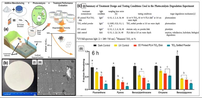 (a) 3D打印PLA-TiO2作为催化剂的重要性(b)i-3D打印PLA-TiO2磁盘的照片,ii-3D打印结构的扫描电子显微镜(SEM)图像。(c) i-显示降解分析的参数,ii-多环芳烃部分保持暴露处理时间6小时