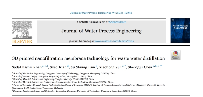 本研究以《3D printed nanofiltration membrane technology for waste water distillation》为题发表在SCI收录期刊《Journal of Water Process Engineering》(IF2021=7.340,JCR Q1区)。该论文是开展3D打印纳米滤膜技术在废水净化应用的研究综述,Sadaf Bashir Khan博士(3D打印与智能制造研究中心,机械工程学院外籍博士后)为本文第一作者,陈盛贵高级工程师和孙晓红教授为本文通讯作者。