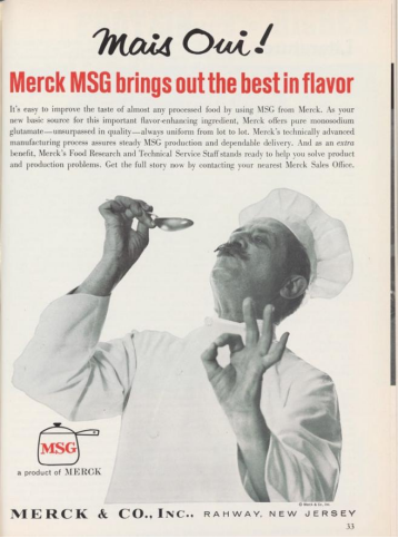但并不是所有美国人对味精有着清楚的认识。在20世纪60年代,一名医生在《新英格兰医学杂志》发表了一篇极具争议的关于“中餐馆综合症”的文章后,味精在美国的名声急转直下。这名医生写道,他在吃了中餐馆的食物后出现了类似于过敏反应的症状。此后不久,《科学》杂志刊登了一篇研究性文章,研究人员向实验室小鼠注射味精,导致小鼠大脑损伤和产生其他神经系统问题。这些文章的发表让美国人抵触味精的情绪越来越高,已至现在很多西方人都对味精和中式及日式有着很重的偏见。