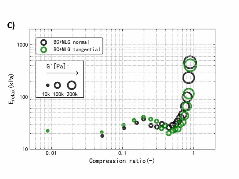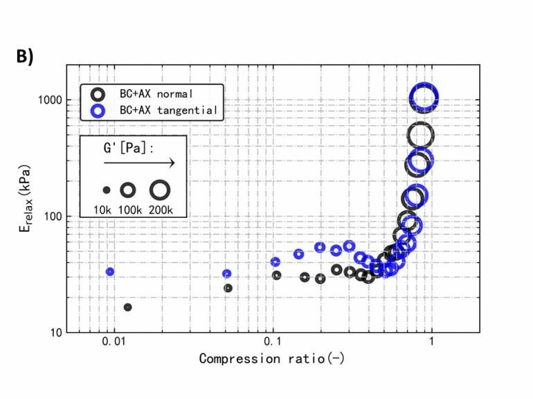研究发现,AX和MLG虽无法对细菌纤维素的结晶结构有显著影响,但可以球状团聚物的形式吸附在纤维表层。而通过两个方向上的力学及流变学测试发现,两种半纤维素在小应变(线性黏弹区,小振幅振荡剪切实验)对细菌纤维素水凝胶的各向异性力学性能影响较小,而在大应变(非线性黏弹区,压缩-应力松弛实验)条件下能减少细菌纤维素水凝胶力学性能的各向异性程度。本研究介绍了一种简单、绿色的方法调控细菌纤维素凝胶的各向异性力学性能,为进一步开发细菌纤维素的利用价值提供了经验。