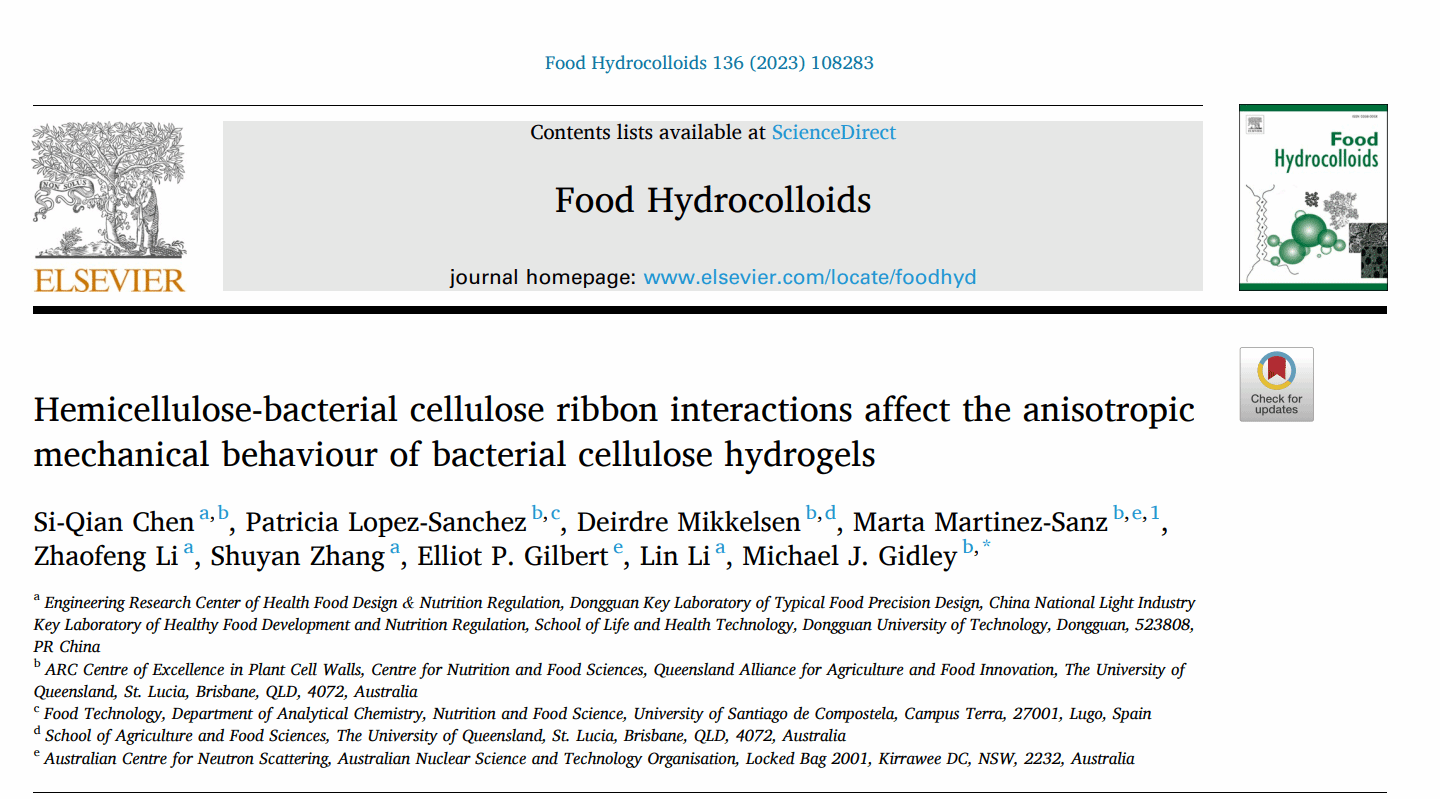 2022年10月,东莞理工学院食品营养健康工程与智能化加工研究中心陈思谦(第一作者)在国际食品顶级期刊《Food Hydrocolloids》(IF: 11.504, Q1)发表了题为“Hemicellulose-bacterial cellulose ribbon interactions affect the anisotropic mechanical behaviour of bacterial cellulose hydrogels”的研究论文。