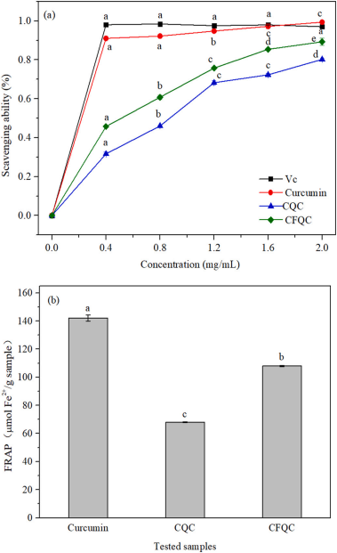 图4 姜黄素在装载CQC和CFQC前后的体外抗氧化活性(a)DPPH自由基清除活性;(b)铁离子还原能力