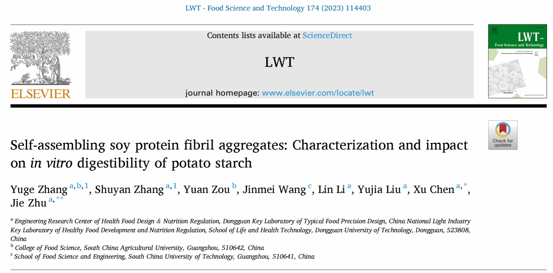 本研究以《Self-assembling soy protein fibril aggregates: Characterization and impact on in vitro digestibility of potato starch》为题发表在SCI收录期刊《LWT-FOOD SCIENCE AND TECHNOLOGY》(IF: 6.056, Q1)。东莞理工学院-华南农业大学联合培养在读硕士张昱格为本文第一作者,东莞理工学院食品营养健康工程与智能化加工研究中心张书艳硕士为共同一作,陈旭博士和朱杰副教授为通讯作者。该论文是我校生命健康技术学院与联合高校共同培养硕士研究生积累的又一新成果。