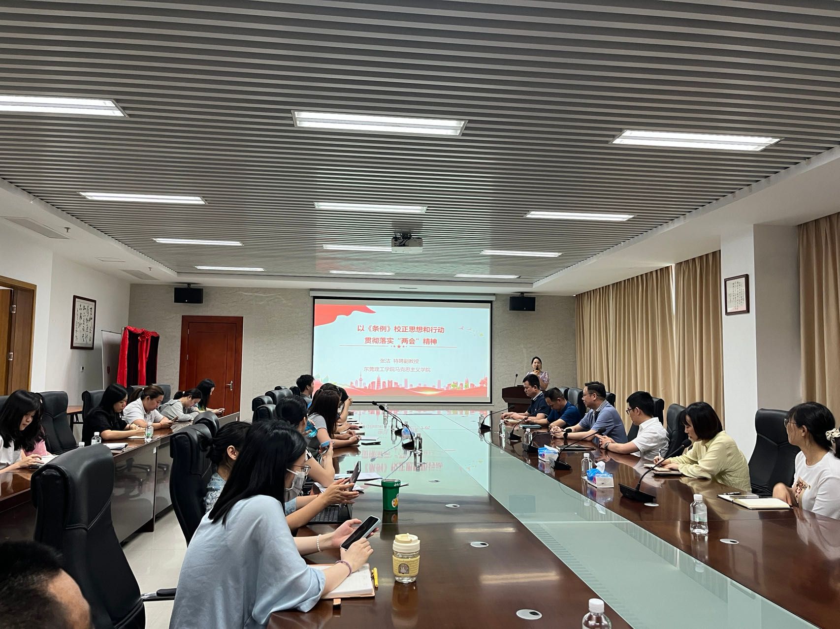 为深入学习贯彻习近平总书记关于党纪学习教育及两会的重要讲话、重要指示精神,认真贯彻落实中央、省委、市委和校党委关于党纪学习教育的工作部署,加强《中国共产党纪律处分条例》(以下简称《条例》)的认识,提高教职工政治站位,5月9日科创院党总支邀请校马克思学院特聘副教授张洁以《以<条例>校正思想和行动贯彻落实“两会”精神》为题辅导报告。科创院与资产经营公司支部党员,教职工参加培训。